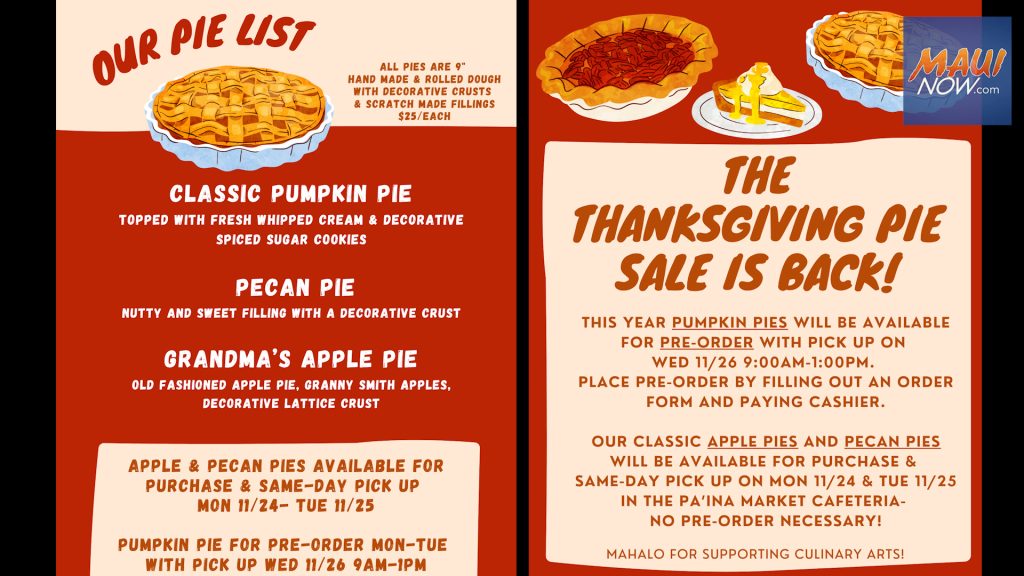 Classic Pumpkin Pie – topped with fresh whipped cream and decorative spiced sugar cookies – are available for pre-order and pre-payment every day from now through Tuesday, Nov. 25 (except for Friday, Nov. 21) in Pā‘ina between 11 a.m. and 1 p.m. Pick up is on Wednesday, Nov. 26 from 9 a.m. to 1 p.m.