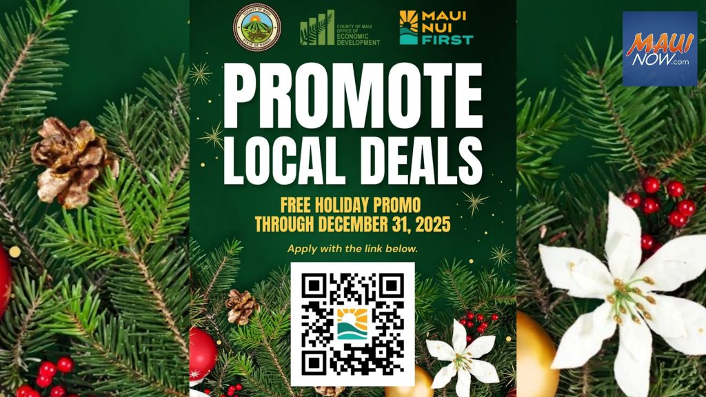 Beginning in late November and continuing through Dec. 31, 2025, MauiNuiFirst.com and its social media channels will spotlight holiday promotions from Maui County businesses. Participation is free and provides added exposure during the peak holiday shopping period.