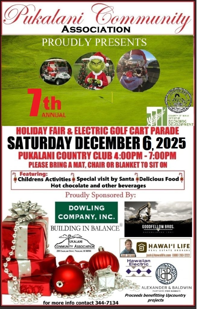Pukalani Community Association’s 7th Holiday Fair and Electric Light Golf Cart Parade will be held on Saturday, Dec. 6, 2025, at the Pukalani Country Club from 4 to 7 p.m. The event is family friendly and free.