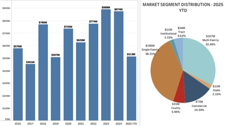 With those large public works projects now winding down, the market has shifted dramatically. The public sector, which made up 74% of total construction value in both 2022 and 2023, now represents just 26% of activity as of the third quarter of 2025.