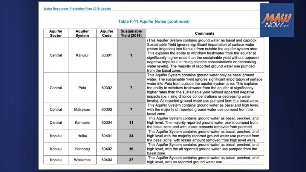 Scheuer cited figures showing pumping of up to 13 million gallons per day from the Kahului aquifer, which has a sustainable yield of 1 mgd, and up to 25 mgd from Pāʻia, with a sustainable yield of 7 mgd.