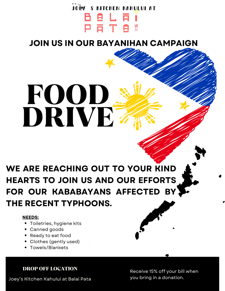 In the wake of the recent typhoon that devastated communities across the Philippines, a Maui based Filipino owned restaurant is stepping up to help. Joey’s Kitchen Kahului at Balai Pata has announced a community-wide food and clothing drive to support relief efforts for families who have lost their homes, belongings and access to basic necessities.
