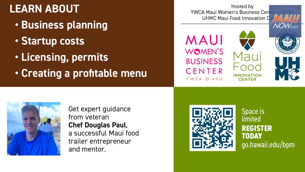 YWCA Maui Women’s Business Center and the University of Hawaiʻi Maui College’s Food Innovation Center launch “From Dream to Drive: How to Launch Your Maui Food Truck” Workshop. The course is offered both online and in-person at UHMC’s Maui Food Innovation Center, happening Thursday, Dec. 11, from 12 to 2 p.m
