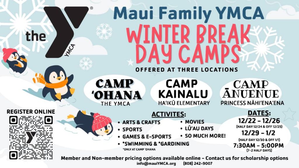 The Maui Family YMCA is hosting Winter Break Day Camps at three sites across the island: Camp ‘Ohana (YMCA in Kahului), Camp Kainalu (Haʻikū Elementary) and Camp Ānuenue (Princess Nāhiʻenaʻena Elementary).