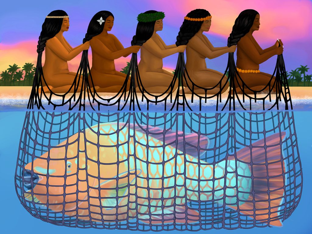 “While rooted in both history and heritage, these artists’ interwoven visions are distinctly contemporary,” said Clark, who runs the gallery. “They each show a great amount of nuance and respect in how they interpret historical narratives and forms, but they are also willing to push the boundaries of their chosen media to connect their stories with current-day experiences across Micronesia, Hawai‘i and the greater Pacific.”