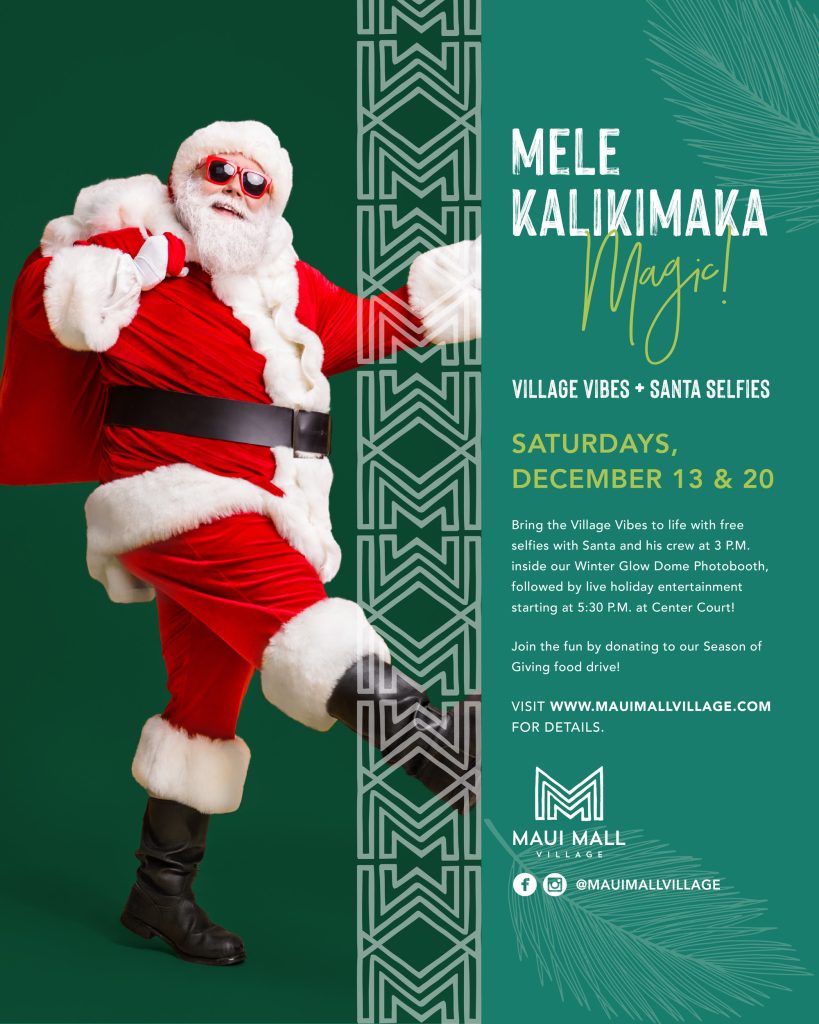 Maui Mall Village invites the community to make the holidays bright with its array of Mele Kalikimaka Magic experiences happening on the two consecutive Saturday afternoons leading up to Christmas. Each afternoon features Selfies with Santa and special holiday performances by community organizations. Plus, for the first time, guests can capture their Selfies with Santa inside a spectacular Winter Glow Dome photo booth, a large holiday-themed inflatable.