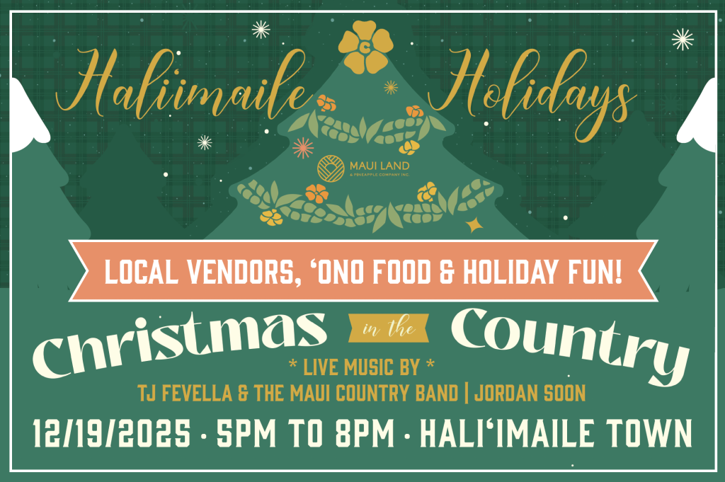 Maui Land & Pineapple Company, Inc. in partnership with Hāliʻimaile Third Friday by Fresh Help Maui, has announced its second annual community celebration, Hāliʻimaile Holidays, taking place on Friday, Dec. 19, 5-8 p.m. This free, family-friendly event invites you to gather and enjoy shopping with over 30 small businesses, food, live music, and a visit from Santa in charming Hāliʻimaile Town.