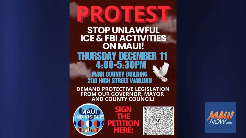 A local civil rights activist group plans to hold a protest rally from 4 to 5:30 p.m. Thursday outside the Kalana O Maui Building in Wailuku, calling on county leaders to reject federal law enforcement partnerships and adopt what organizers describe as “protective legislation” for Maui.