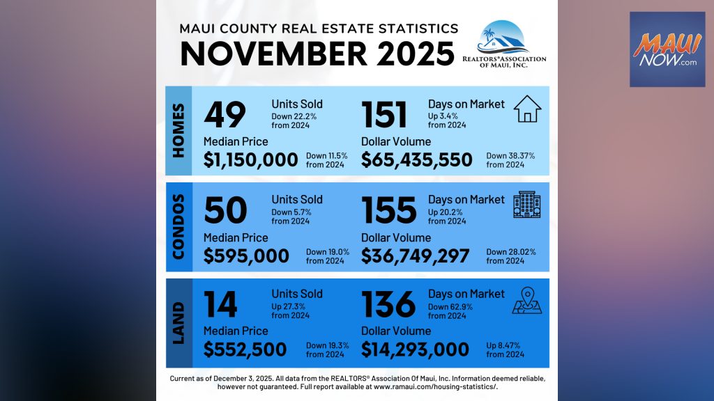 Maui’s housing market continued to soften in November, with year-over-year declines in both single-family home and condominium sales, according to the Realtors Association of Maui. Single-family home sales dropped by 22.2%, while condominium sales fell 5.7%. Median sales prices also declined, with single-family homes down 11.5% to $1,150,000, and condominiums down 19.0% to $595,000.