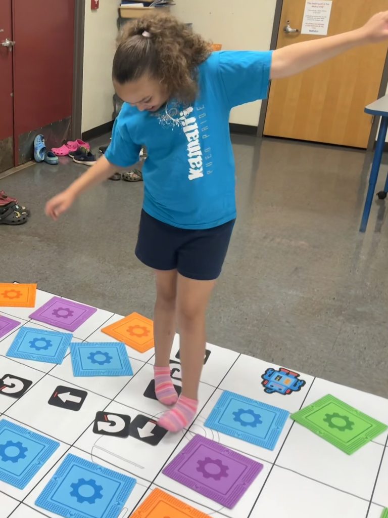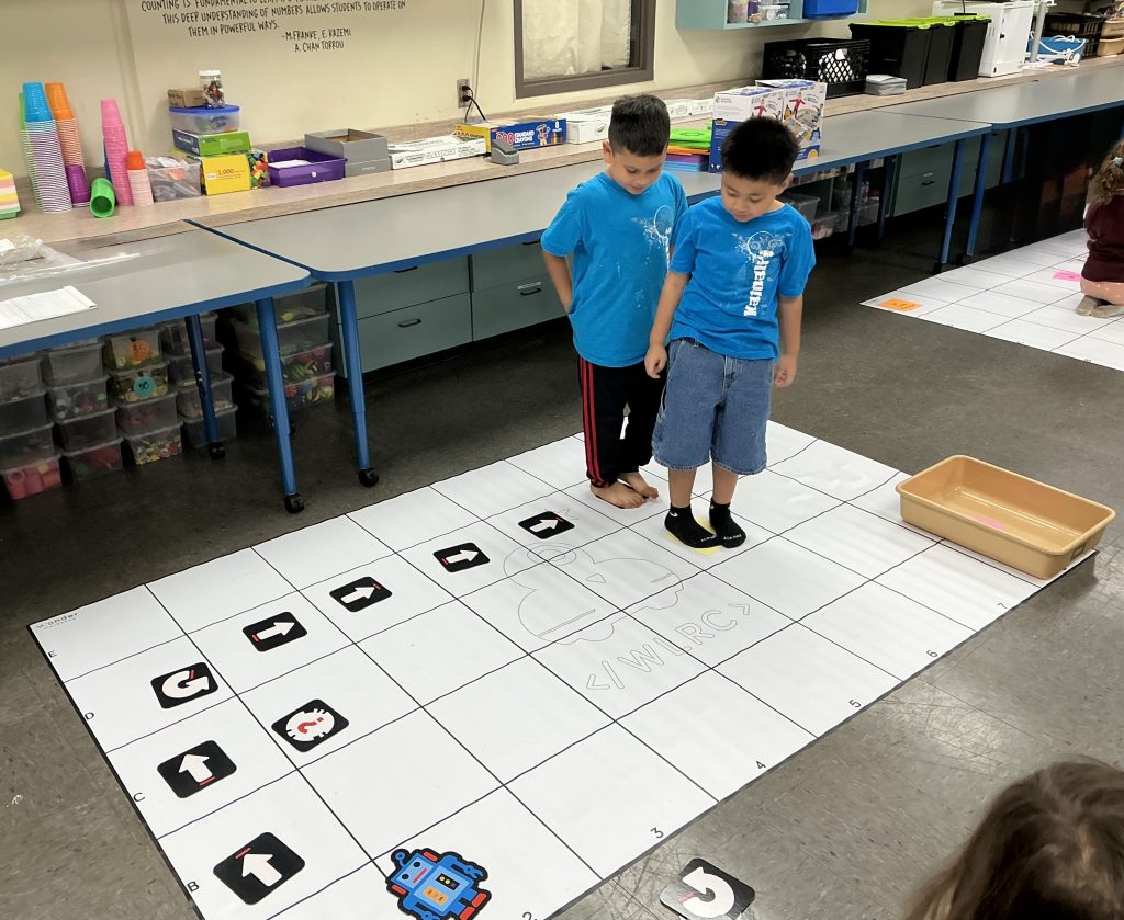 To make the subject matter accessible to the youngest students, the school used “unplugged” lessons. In a game titled “Be the Robot,” students in kindergarten through 2nd grade used physical coding blocks and floor mats. Students guided partners toward a destination, a process intended to teach sequencing and giving clear instructions.