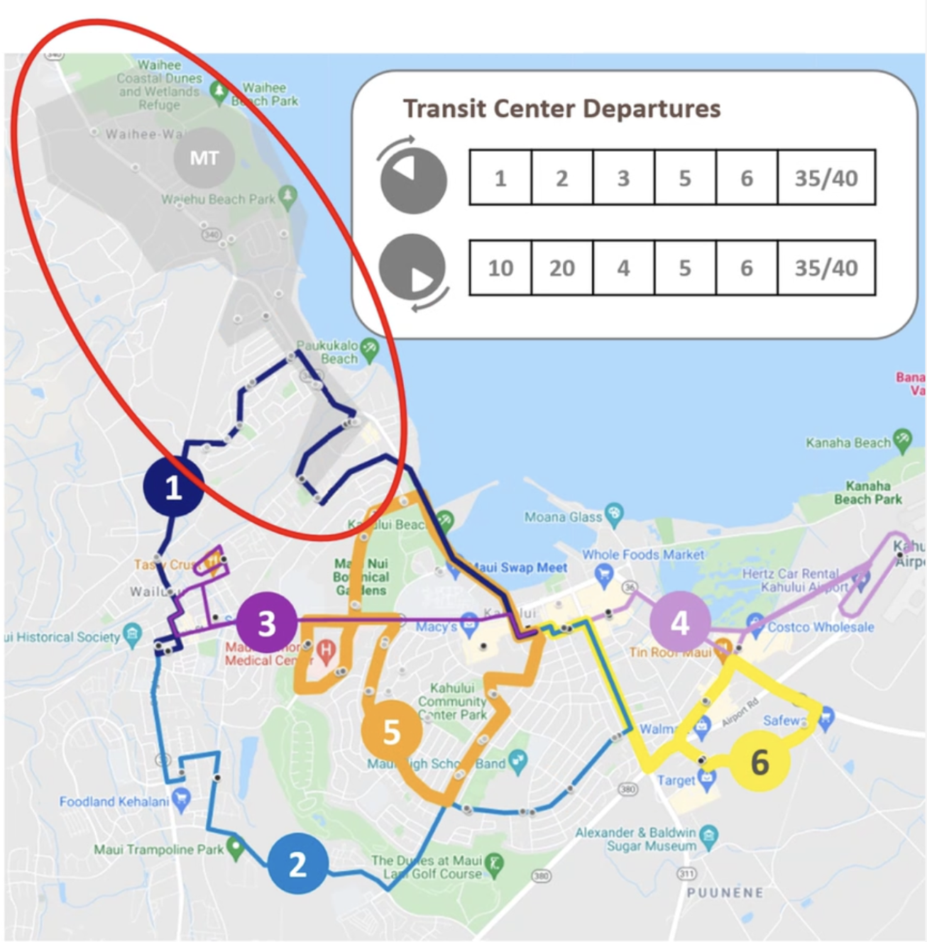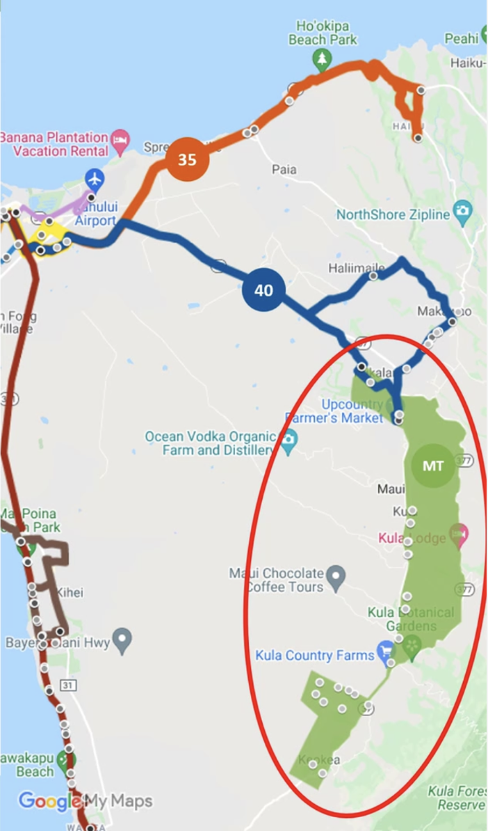 The idea is to replace the two fixed routes with a zone that encompasses the current bus stops in both areas. In Waihe‘e, the zone would range from Kahului Harbor to the Waihe‘e Coastal Dunes, with a direct connection to the Kahului Transit Center, where riders can access the rest of the bus network. In Kula, the zone would stretch from Pukalani to Kēōkea and require a transfer to get to the Kahului Transit Center.
