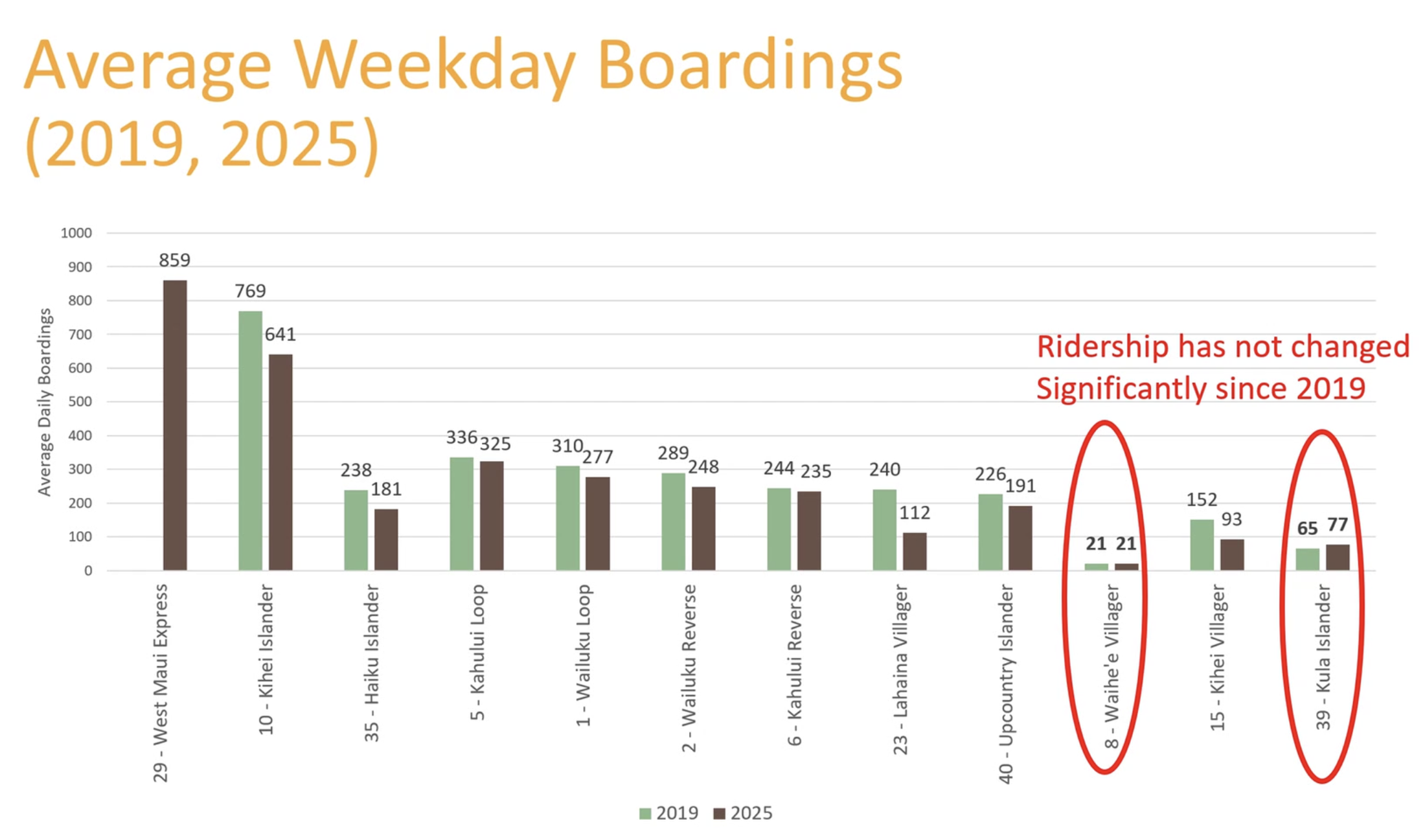 The study showed that the Waihe‘e Villager and Kula Islander were the least-ridden routes at the time, and that was still the case in 2025, Soderberg said.