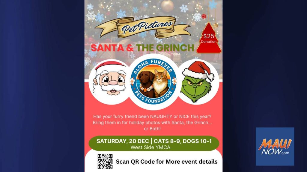 Aloha FurEver Pets Foundation will host a holiday photo fundraiser on Saturday, Dec. 20, at the West Side YMCA Resource Center in Lahaina. Pet owners are invited to bring their cats and dogs for festive photos with Santa and the Grinch.