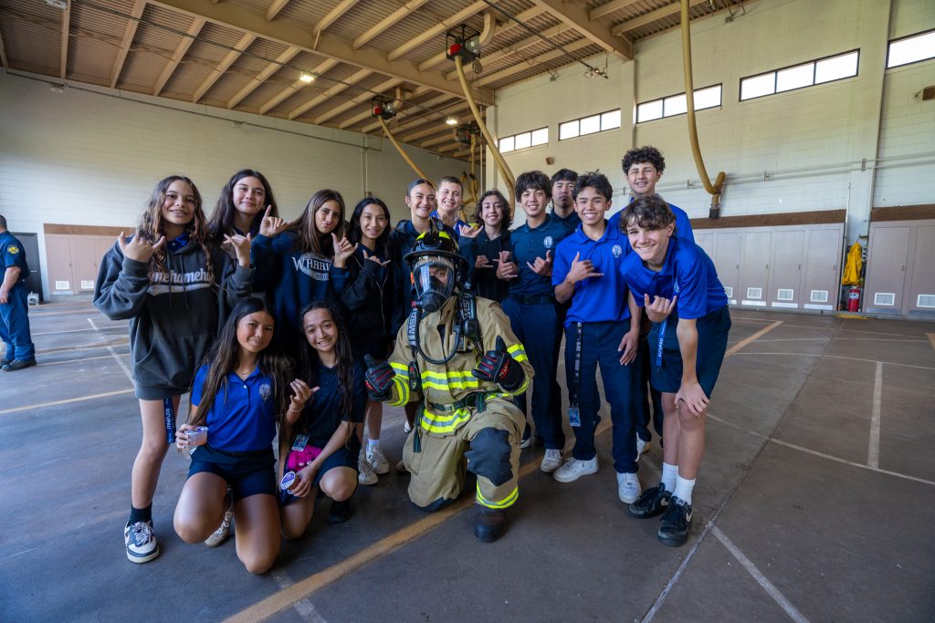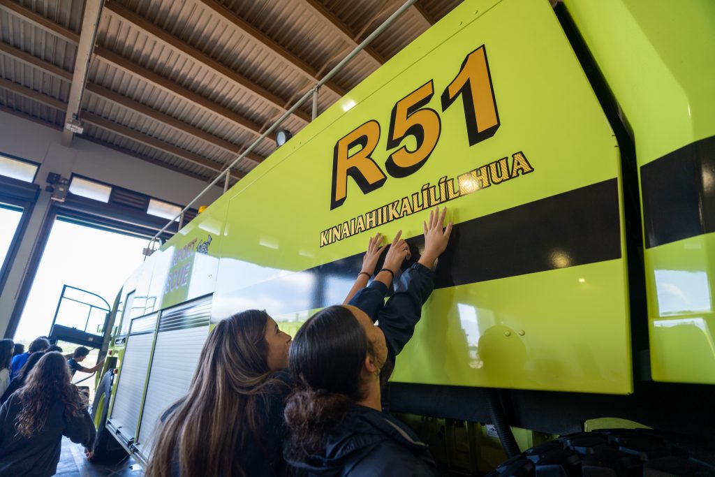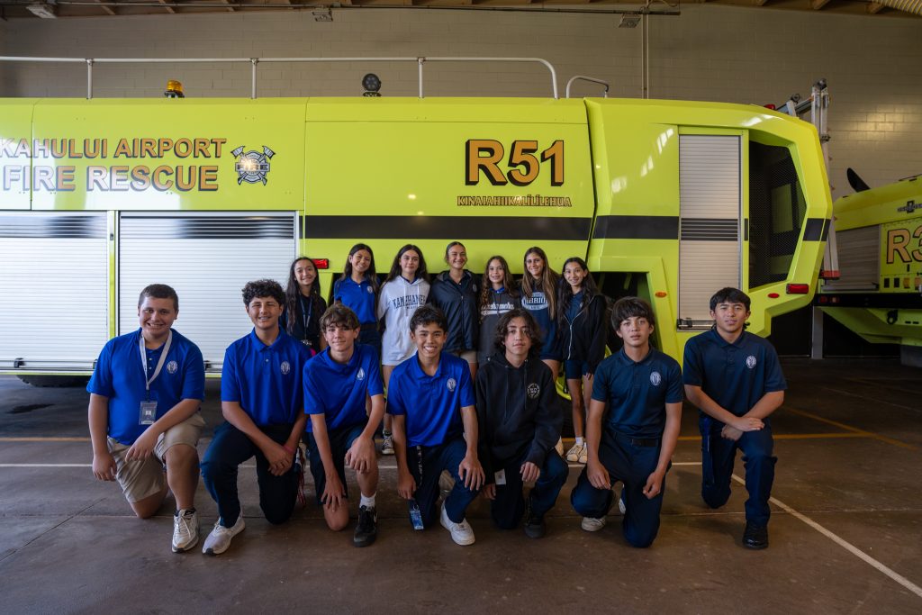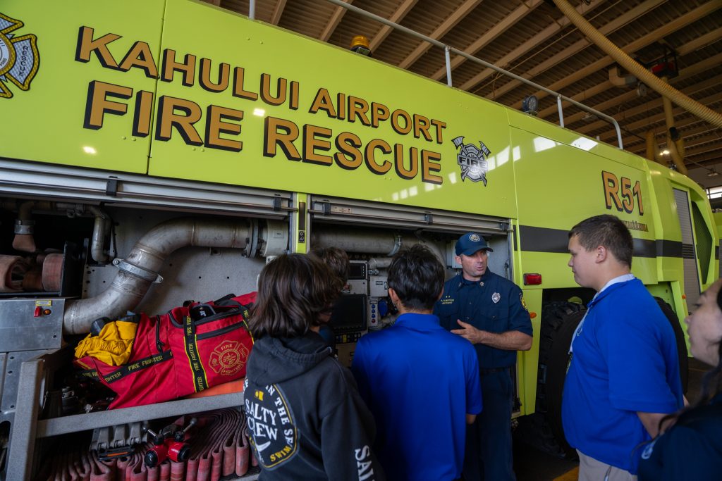 The haumāna gave a presentation to the Kahului Airport firefighters, including ARFF Fire Chief Matthew Pires (KSM ’06) before holding a blessing ceremony. Students also had the opportunity to sit in the new fire truck and operate the water hose and horn.