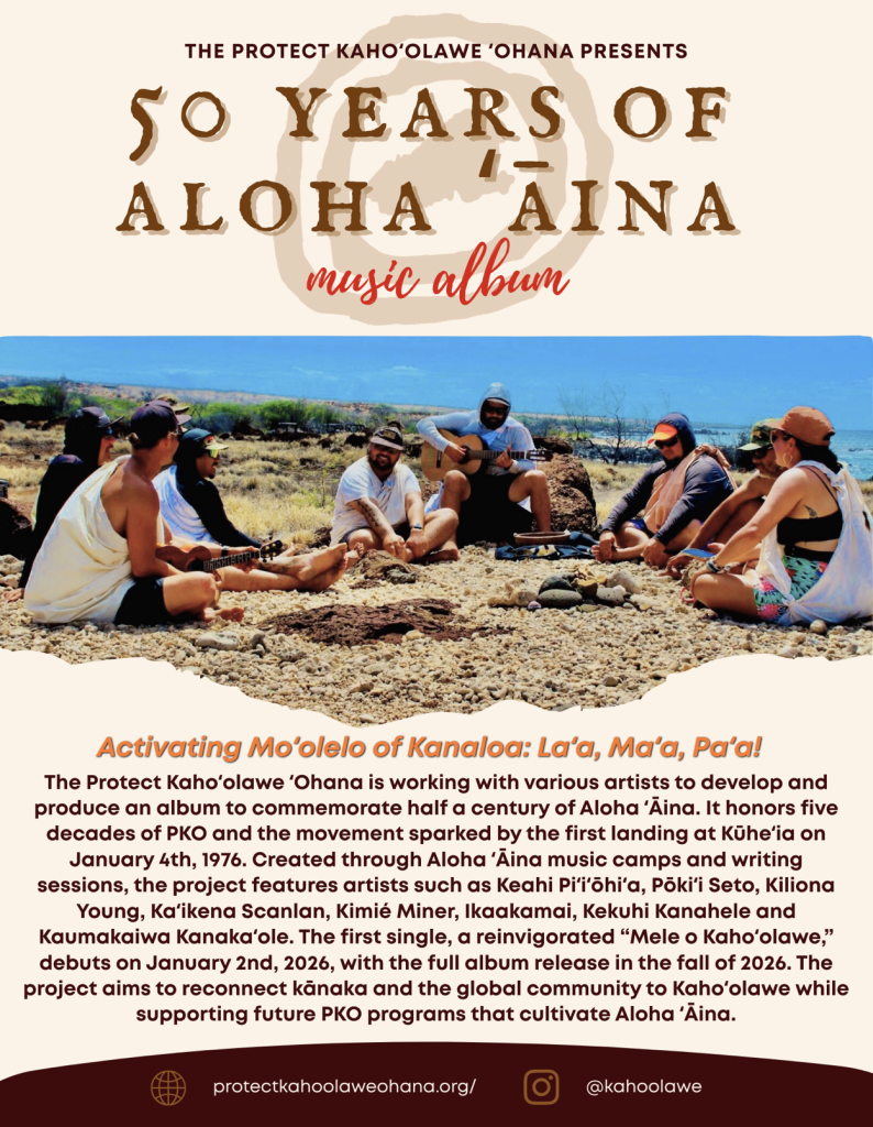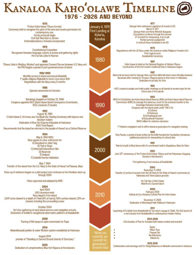 Below is also a timeline of the ʻOhana’s accomplishments as well as an initial calendar of key events celebrating 50 years of Aloha ʻĀina with the Protect Kahoʻolawe ʻOhana across the archipelago.