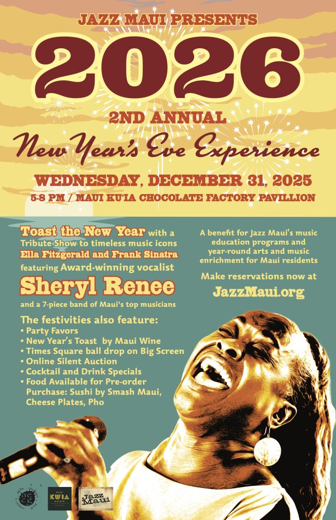 The event serves as a fundraiser for Jazz Maui’s music education programs and features a tribute to jazz legends Ella Fitzgerald and Frank Sinatra. The performance will be held in the upstairs open-air pavilion of the factory, located at 78 Ulupono St.