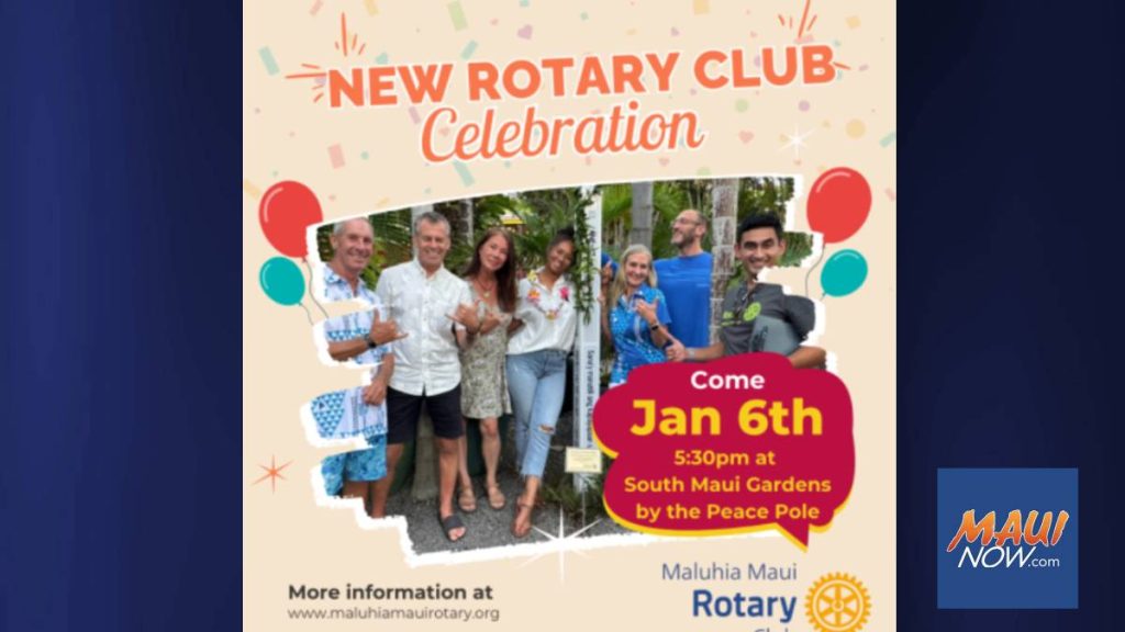 Community members are invited to celebrate the launch of a new Rotary Club in South Maui at the Maluhia Maui Rotary Club Celebration on Tuesday, Jan. 6 at 5:30 p.m., held at South Maui Gardens by the Peace Pole.