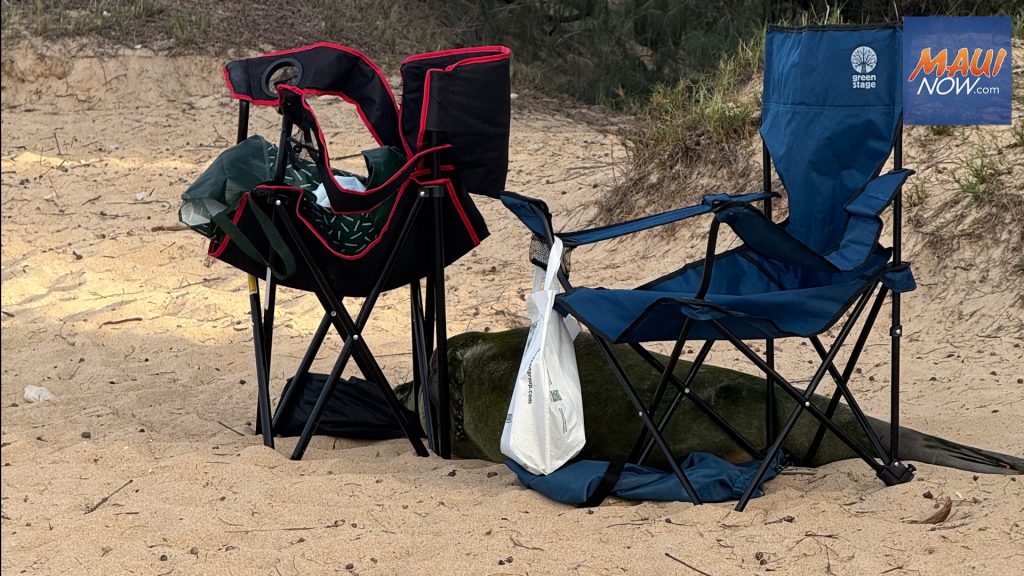 Monk seal finds shady spot under beach chairs along Maui’s North Shore