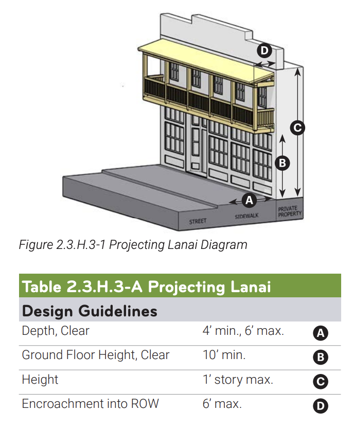 The guidelines break down specific measurements such as walkway widths, building heights, facade widths, projecting lanai and awnings.