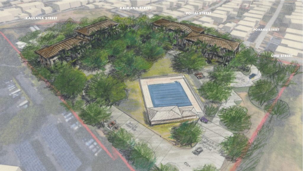 Rendering – Workforce Housing Site Plan Rendering within Kahului Community Center Park- Aerial view. Photo Credit: Hale Makua/Alakaʻi Development.