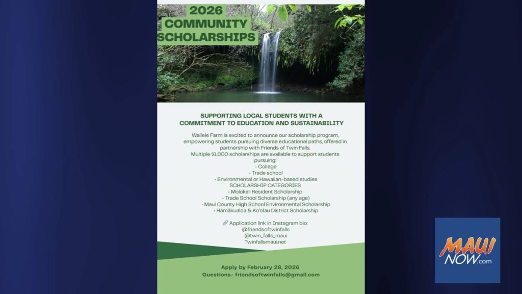 Students and families across Maui County have until Feb. 28 to apply for the 2026 Community Scholarship Program, a joint initiative by Wailele Farm and Friends of Twin Falls.