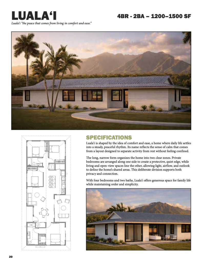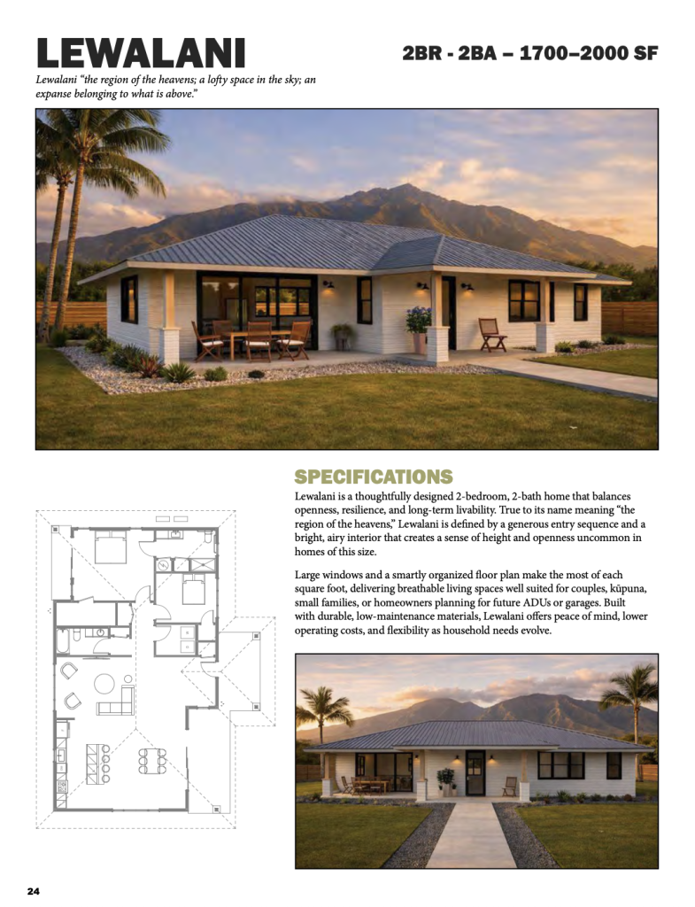 Twelve home design options are offered to meet the needs of different ‘ohana. The designs were developed with Lahaina in mind, balancing Firewise construction with forms and layouts familiar to the community. Floor plan selection will be based on the permitted square footage to the original dwelling prior to the fire, with comparable bedrooms and bathrooms.