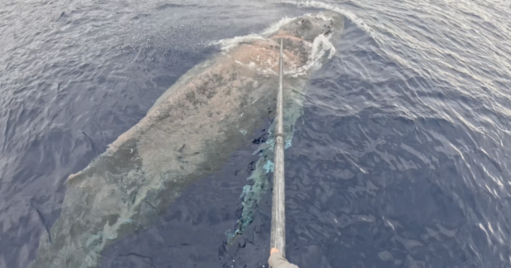 The whale’s calm behavior allowed for close approaches, and the sanctuary team was able to thoroughly assess the animal. The nature of the deep, cyamid-covered wounds made it impossible to determine whether there was still gear present. Out of an abundance of caution, the team decided to make surgical cuts to remove any potentially remaining life-threatening wraps that may have been embedded in the wounds.