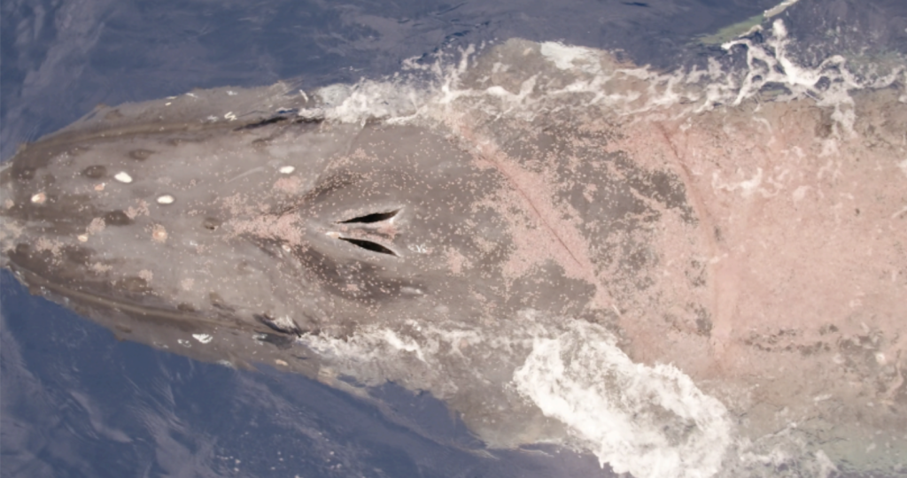 She was found to be in poor to moderate condition, showing moderate to strong emaciation and widespread carpets of red-colored cyamid amphipods (whale lice) across her otherwise light-colored body.