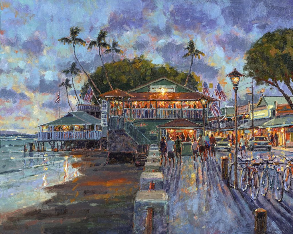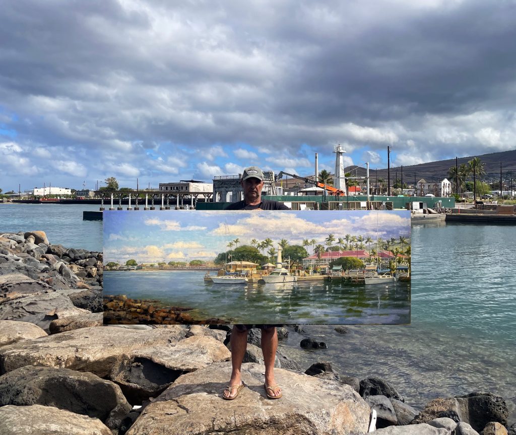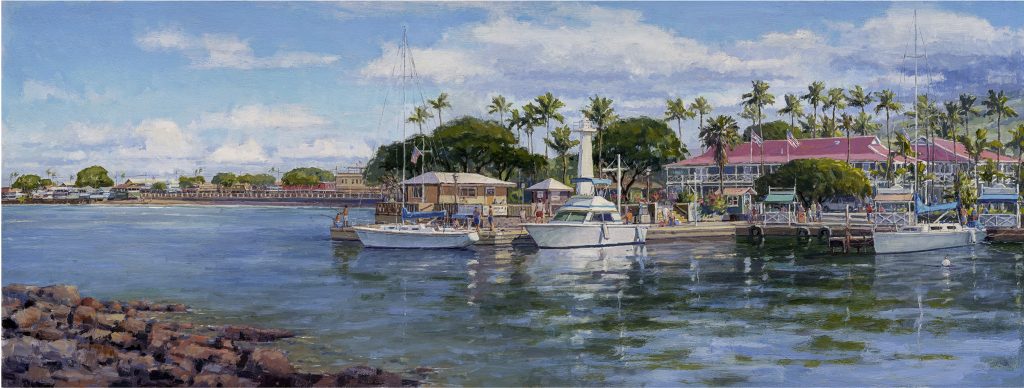 Macedo recently completed what he considers one of his most sentimental works to date. With a deep affection for Lahaina Harbor, he felt a strong pull to recreate one of his favorite views in a large panoramic format.