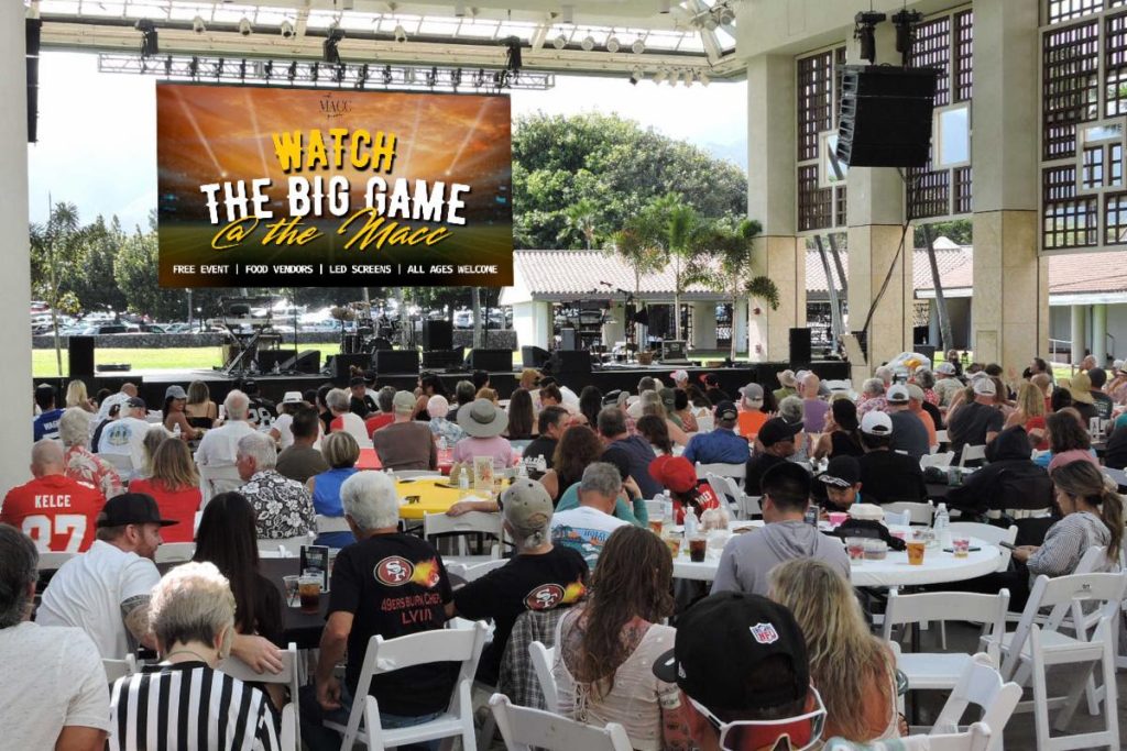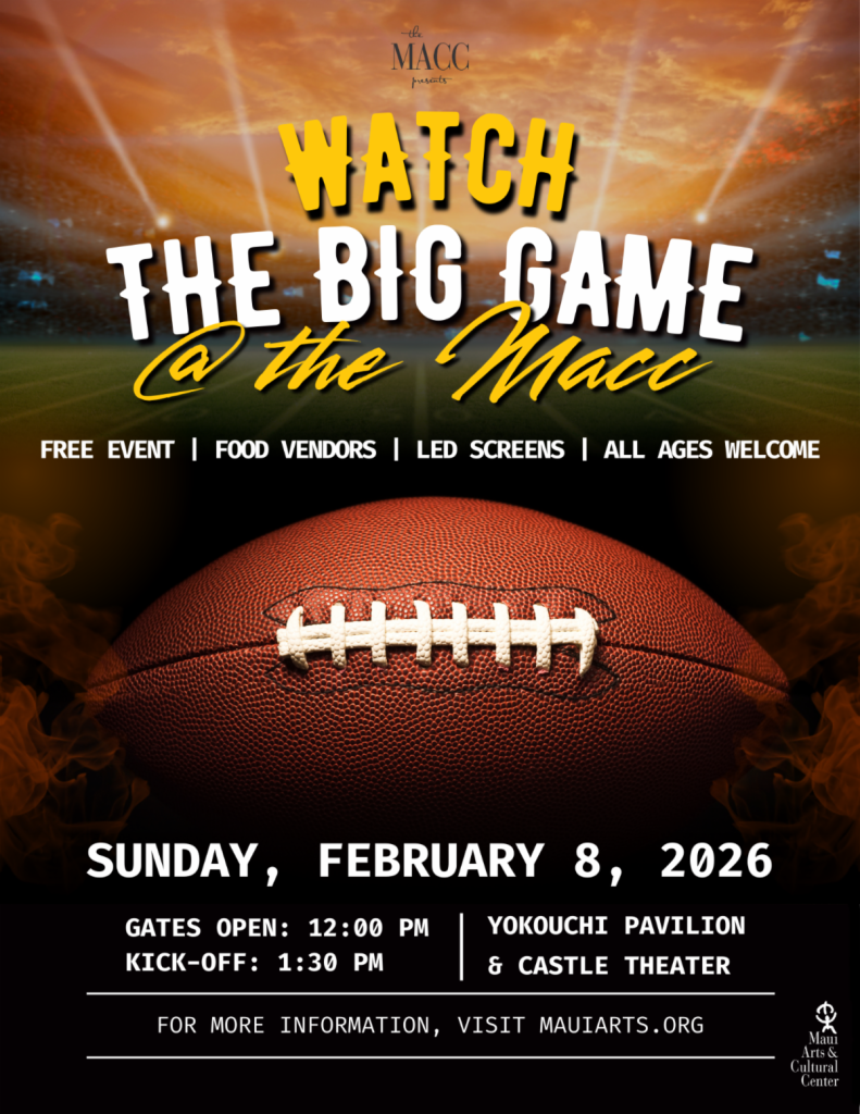 The Maui Arts & Cultural Center hosts viewing of The Big Game on two screens—indoors at the Castle Theater, and outdoors at the Yokouchi Pavilion—on Sunday, Feb. 8. Gates open at 12 p.m., and kickoff is at 1:30 p.m.