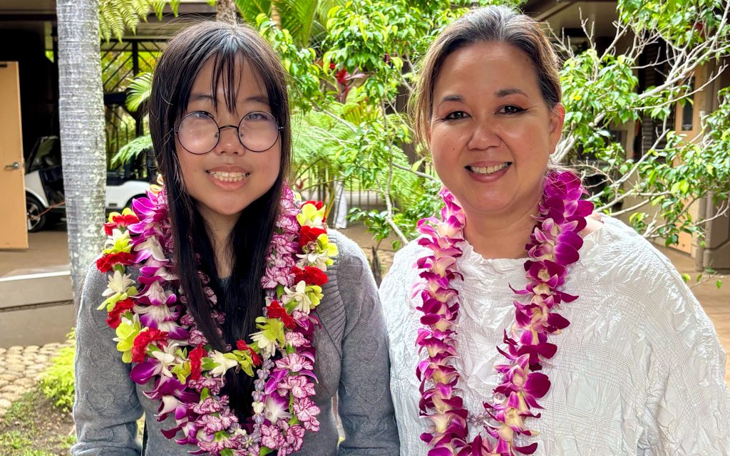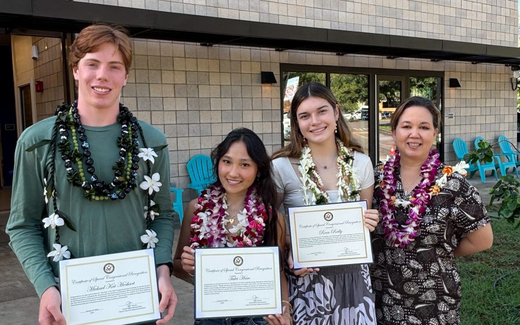 Also at Le Jardin Academy, Rep. Tokuda surprised Talei Ham with news of her third place win for KanuWise. She teamed up with Reese Reilly, a Mid-Pacific Institute student, who also went to campus for the surprise. Their app helps users both identify and learn about plants found in Hawaiʻi.