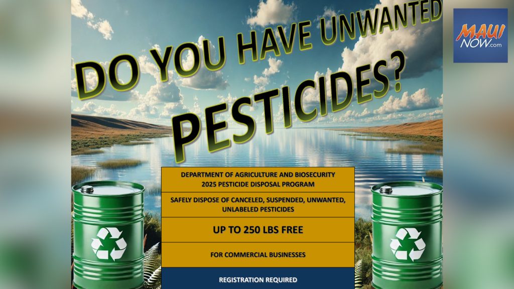 Lāna‘i will have another opportunity to safely dispose of unwanted pesticides next month as the Pesticides Branch of the Hawaiʻi Department of Agriculture and Biosecurity continues its second annual statewide Pesticide Disposal Program for commercial users of pesticides.