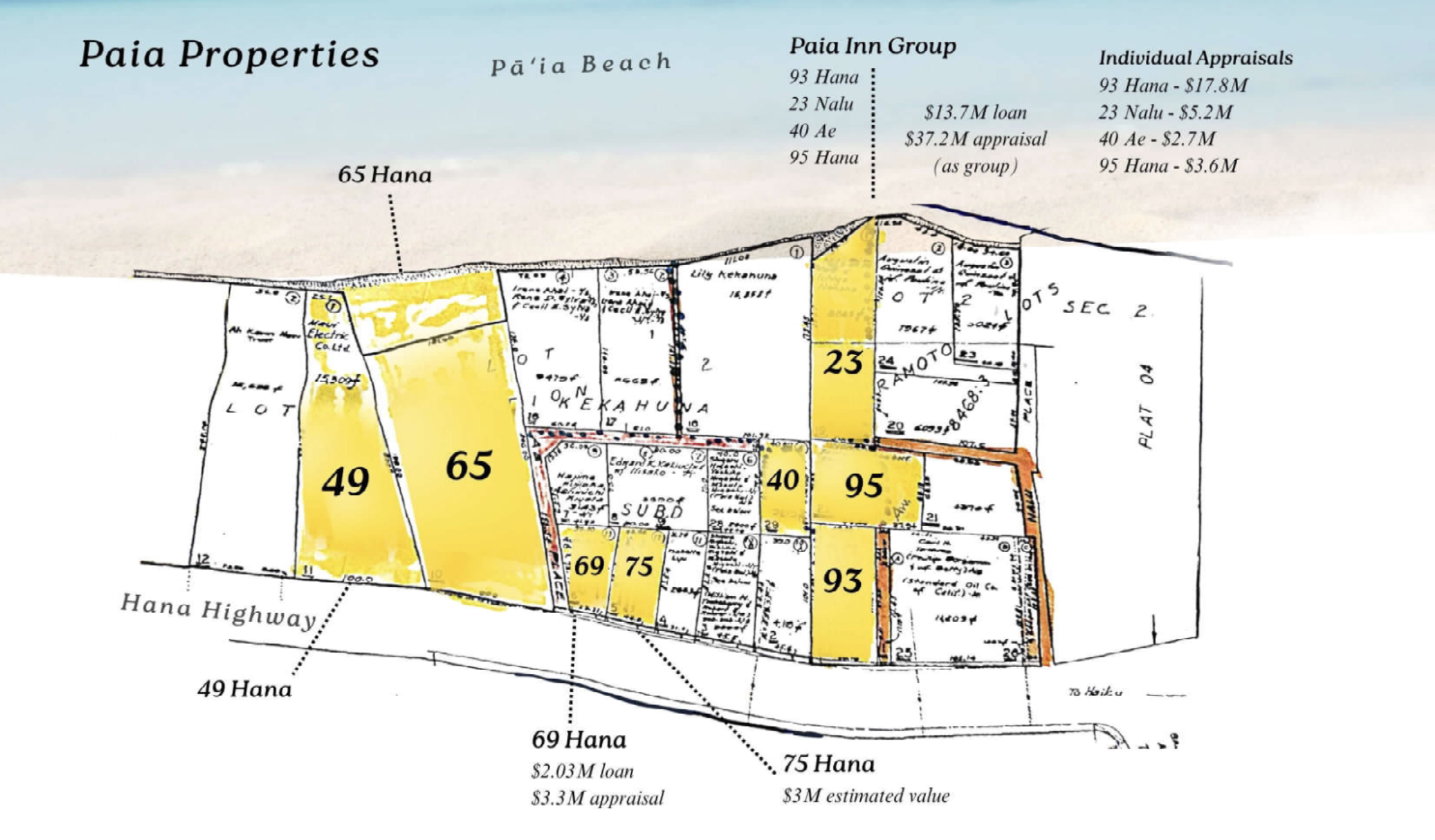 - Paia Inn, a nine-room inn with ground-floor retail and a restaurant and bar at 93 Hāna Highway. Appraised at $17.8 million, according to court documents.