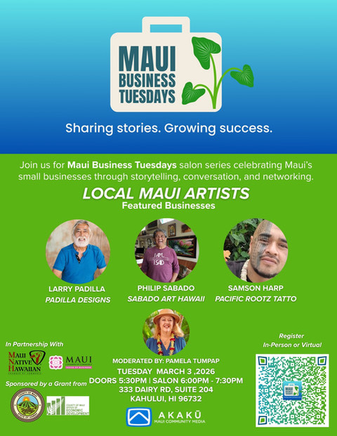 Akakū Maui Community Media will host itʻs March Maui Business Tuesdays event with the theme “Maui Local Artists.” The salon will be held Tuesday March 3, 2026 from 6-7:30 p.m. at Akakū Center in Suite 204 & hybrid via Zoom webinar.