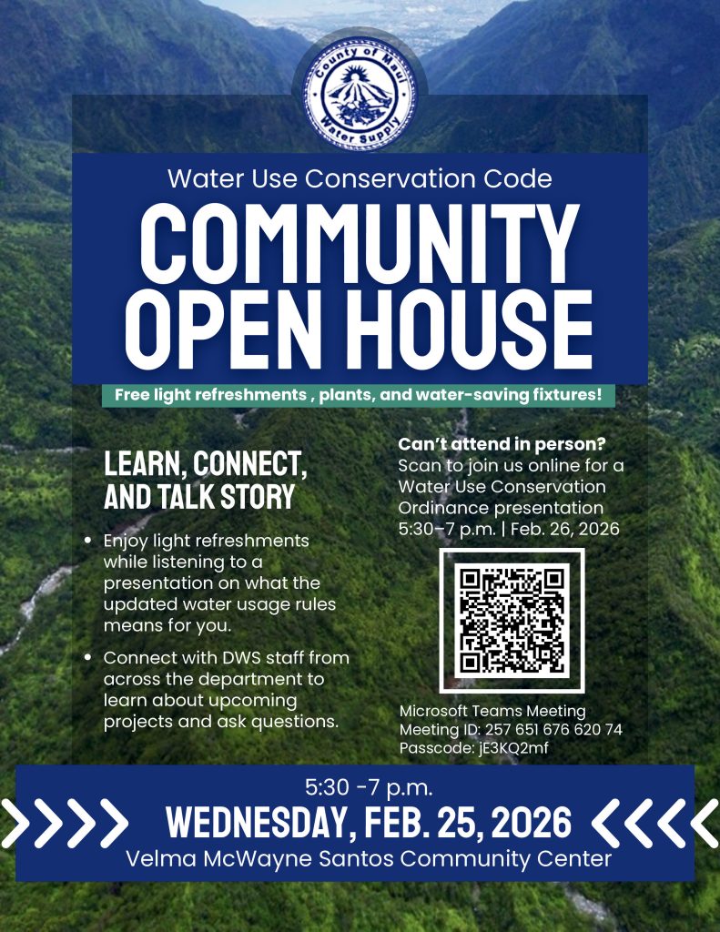 The County of Maui Department of Water Supply invites the public to a community open house from 5:30 to 7 p.m. Wednesday, Feb. 25, 2026, to learn about recent amendments to Maui County’s Water Use Conservation rules, which take effect March 1, 2026.