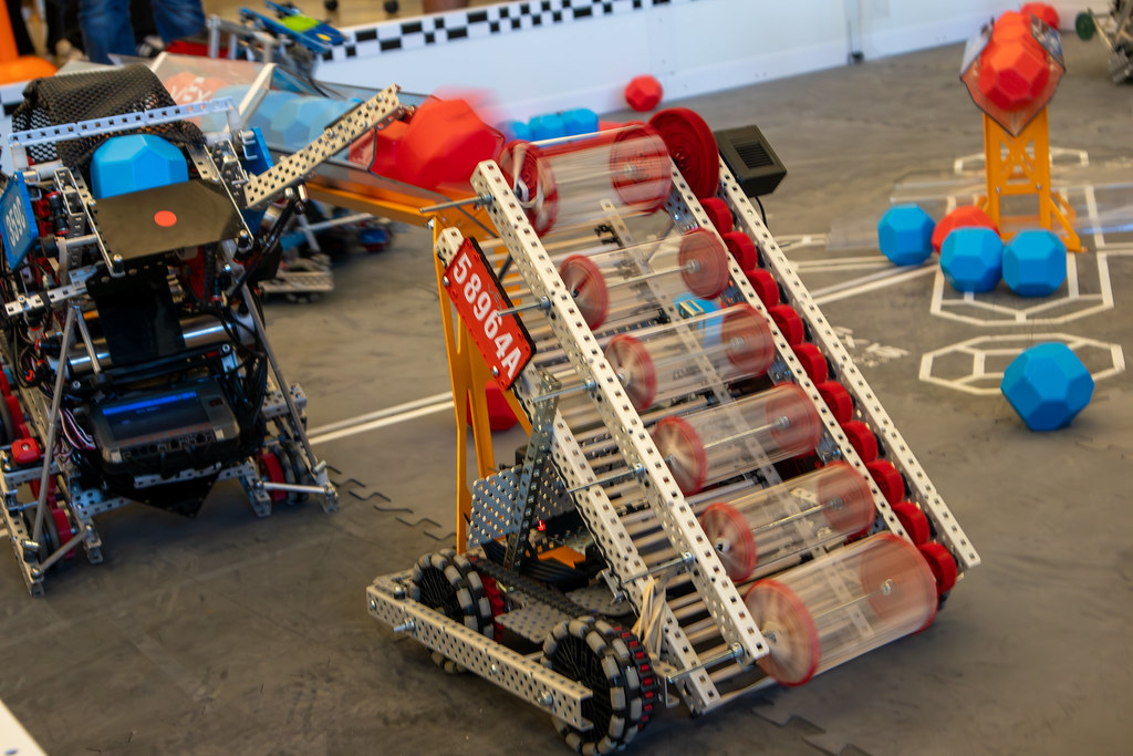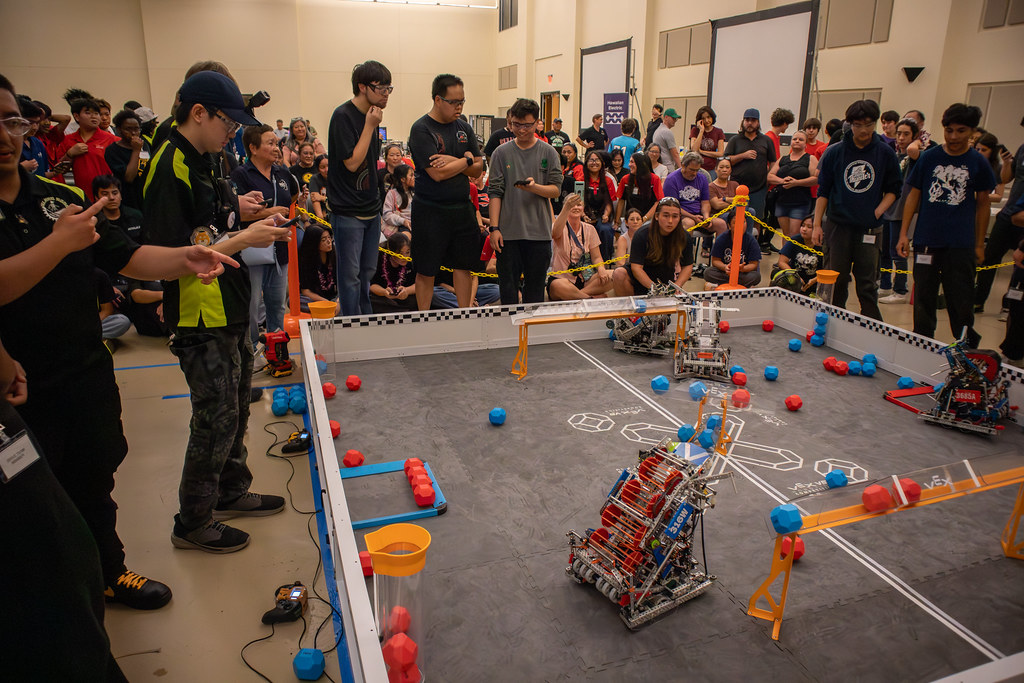The VEX V5 Robotics Competition featured both high school and middle school teams. This year’s challenge, Push Back, is a fast-paced game that pits alliances of two teams against another alliance and requires robots to score blocks in goals, control zones within goals, and park in defined zones at the end of the match. Robots have a 15 second period of autonomous play followed by a one minute and 45 second driver-controlled play.
