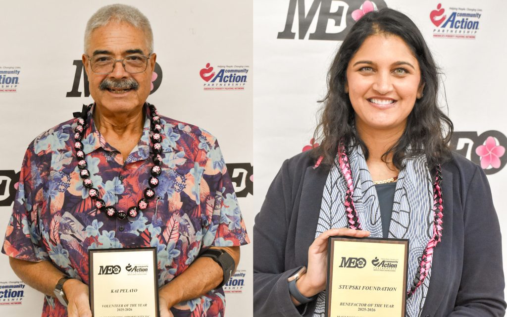 Wildfire survivor and advocate Kai Pelayo and the Stupski Foundation, which gifted Maui Economic Opportunity $450,000 for early childhood programs, were named Volunteer and Benefactor of the Year respectively at MEO’s annual Volunteer Luncheon on Friday, Feb. 13.