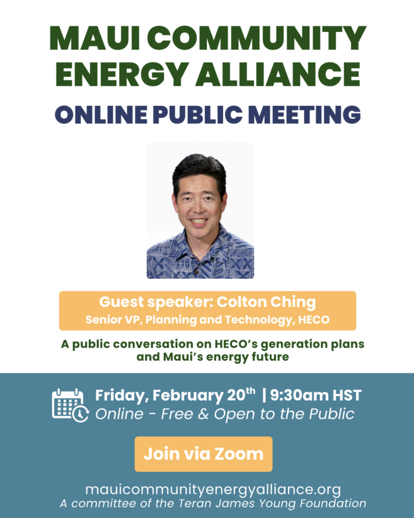 The Maui Community Energy Alliance, a committee of the Teran James Young Foundation, invites the community to attend the online public meeting focused on Maui’s energy future.