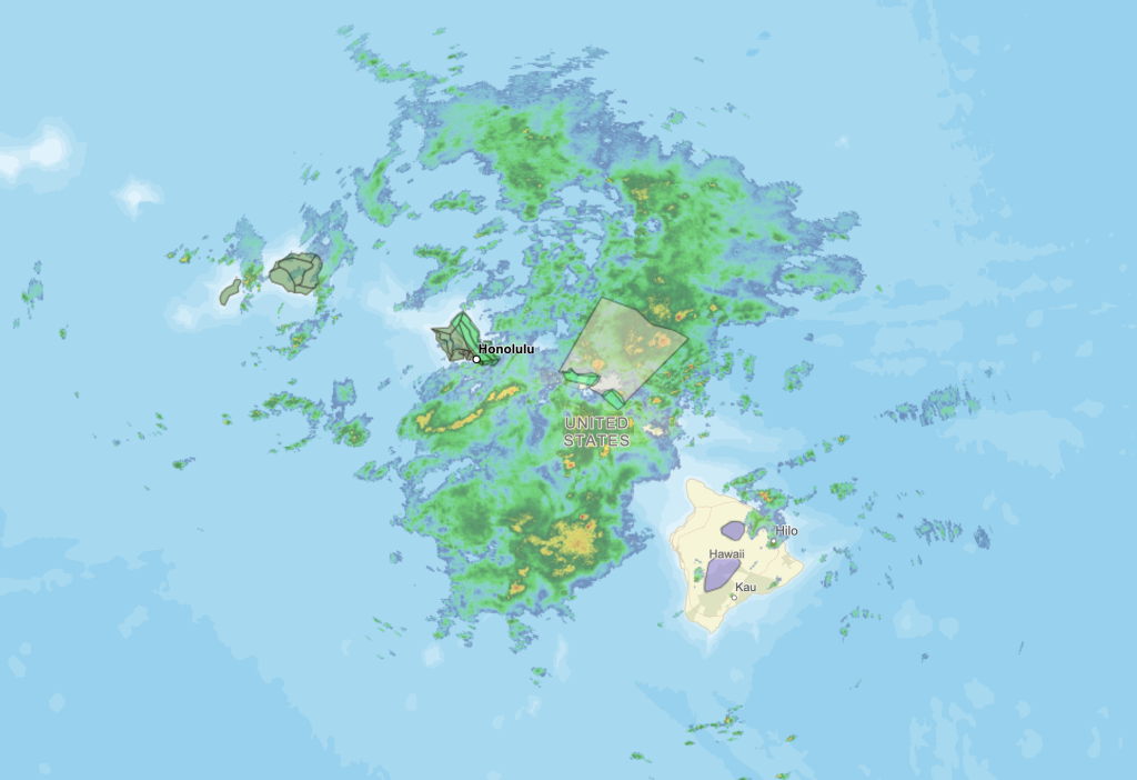 At 5:38 p.m., radar showed heavy rain over northeast Molokaʻi with rain rates of 1 to 3 inches per hour. Hālawa stream is showing a sharp rise and some flooding impacts are expected along windward Molokaʻi.