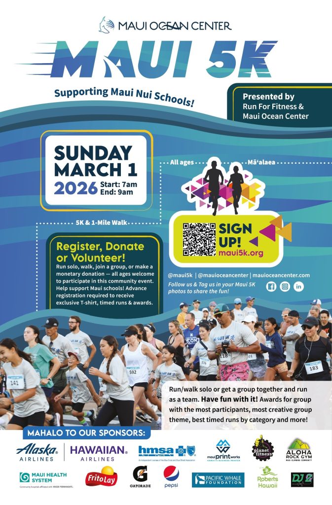 Participants have the option to take part in a 5K run through Māʻalaea or walk an alternate mile-long loop. For those who can’t attend, a virtual run or walk is also offered. Proceeds from the event go directly to the community, providing funding for local schools.