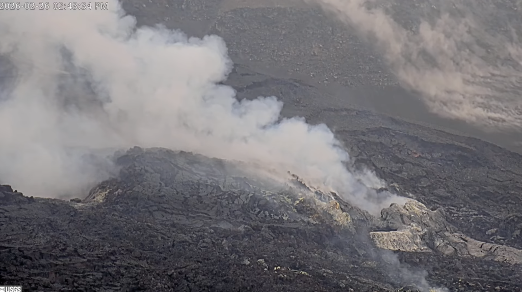 “At the time of this report, both vents are quiet and emitting robust degassing plumes. Low seismic tremor continues through the pause, punctuated by more energetic bursts every 5-10 minutes. These bursts have been associated with brief increases in gas emission and increases in glow from the vents at night. There was one earthquake less than M1.0 located in the summit region in the past 24 hours,” according to HVO scientists.