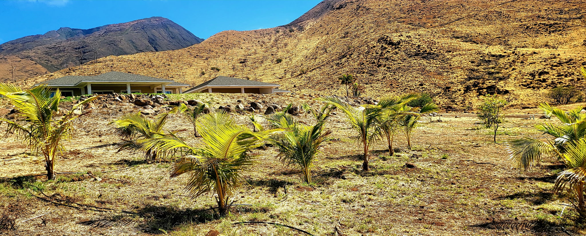 Young palm trees line the arid Olowalu landscape where Guinevere Noble and her family live. Photo courtesy: Guinevere Noble