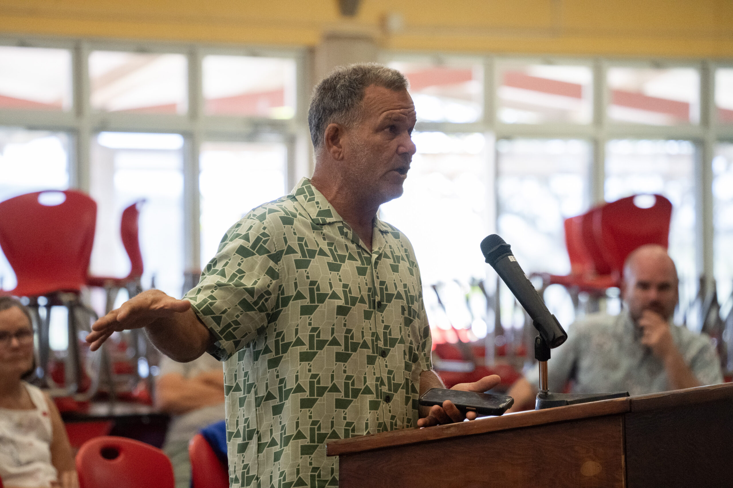 Public Utilities Commission Chairperson Jon Itomura speaks during a public hearing on Olowalu Water Company’s proposal to raise rates by 325% on Tuesday, March 3, 2026, at Lahainaluna High School. HJI / COLLEEN UECHI photo