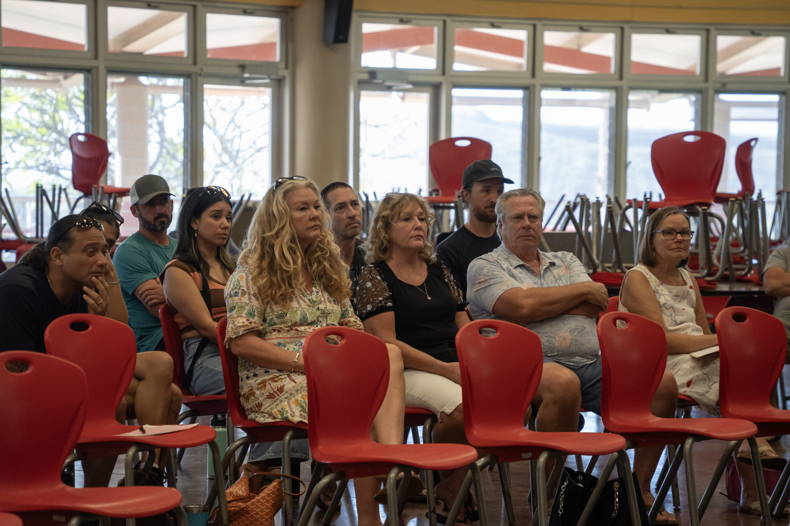 Olowalu residents listen to testimony during a public hearing on Olowalu Water Company’s proposal to raise their water rates by 325% on Tuesday, March 3, 2026, at Lahainaluna High School. HJI / COLLEEN UECHI photo