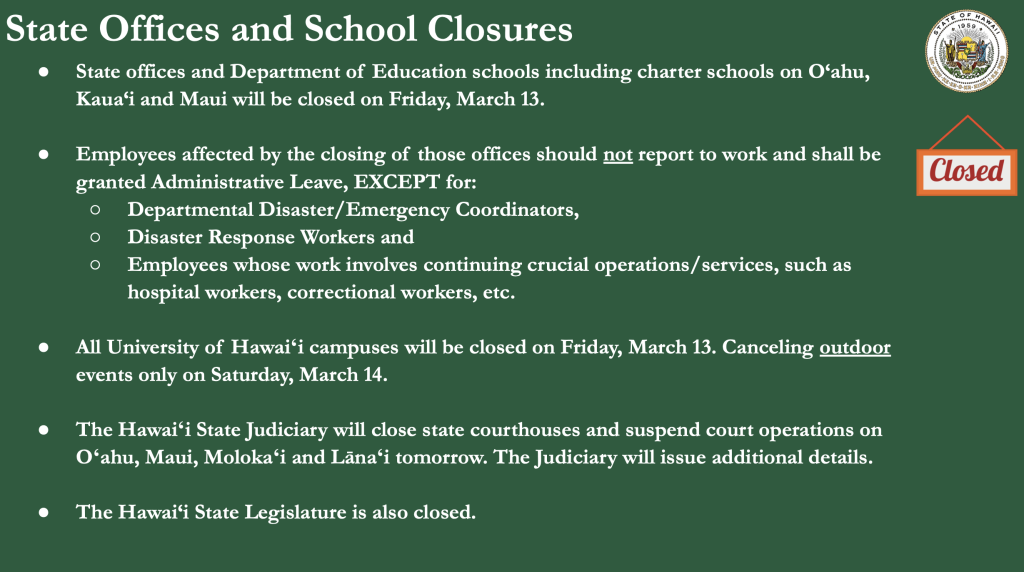 The Hawai‘i State Legislature also will be closed on Friday, March 13.