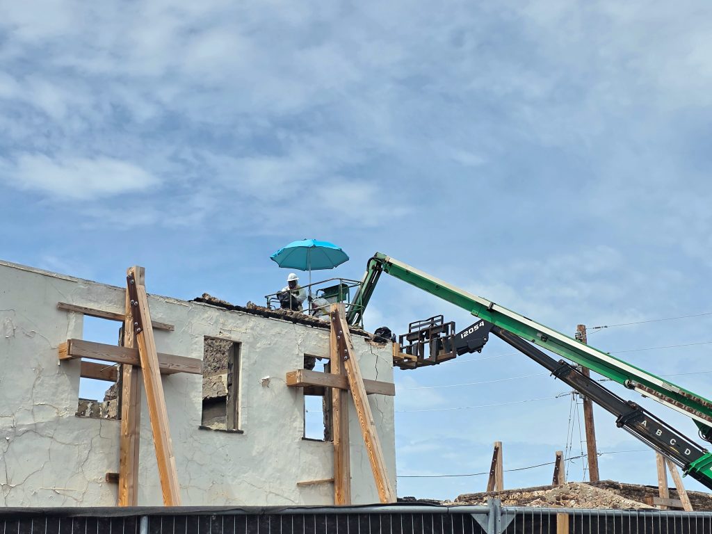 Premier Restoration personnel started using mechanical lifts to dismantle the two-story building’s north and south gable walls. Foundation officials said the walls had begun to weaken and lean inward, requiring careful work to preserve the structure.