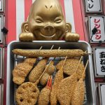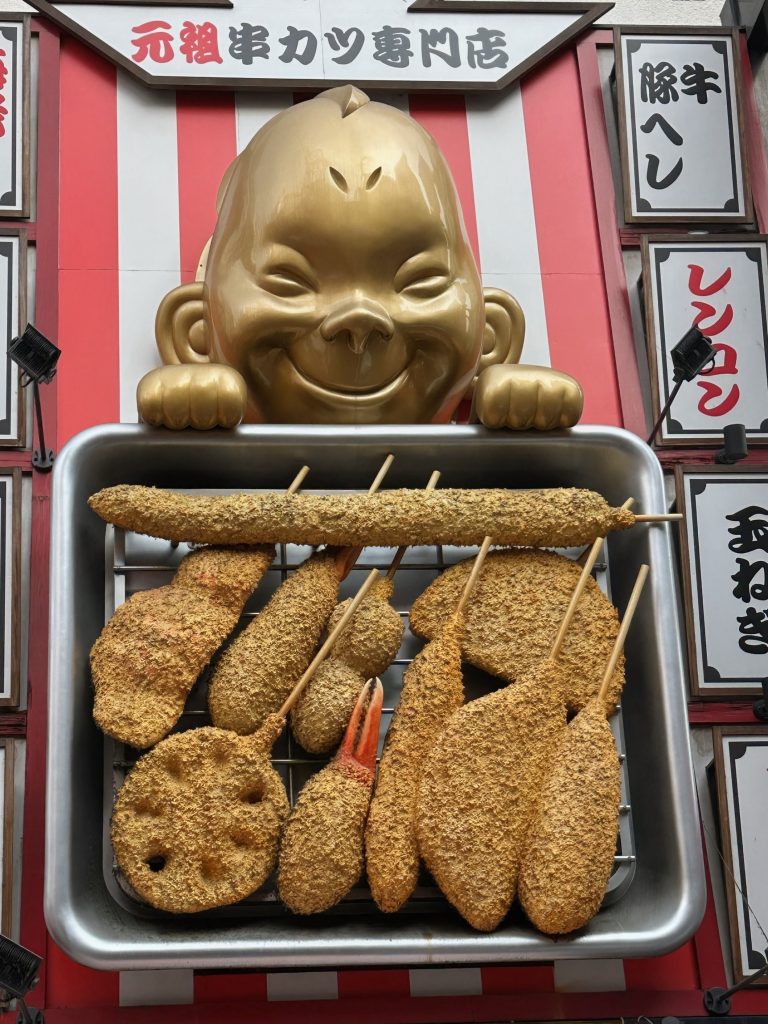 • A smiling face greets visitors to Kushikatsu Daruma, an iconic restaurant chain in Osaka. The tray of food represents skewers of lotus root, crab claw, asparagus and various meats and seasonal vegetables. PC: Brian Perry