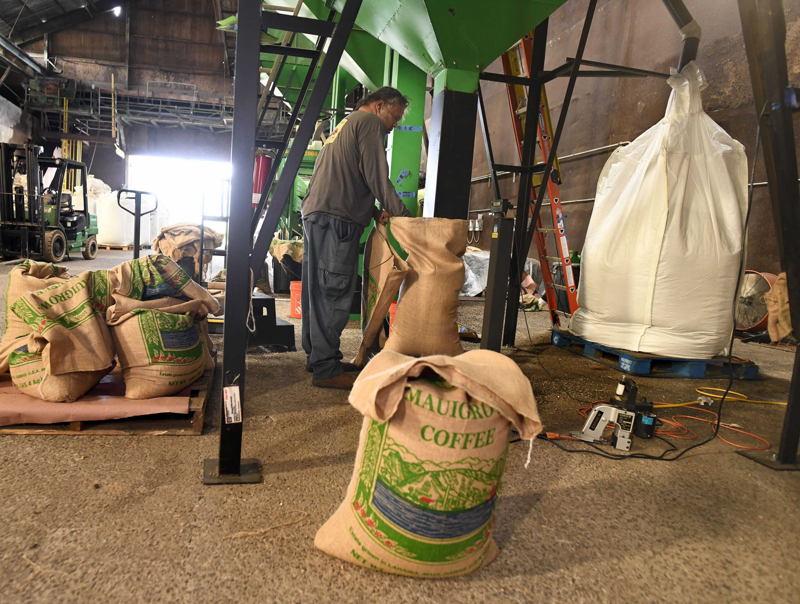Maui Grown Coffee mill worker Kyle Abilay tops off a 100-pound bag of coffee beans in the company’s temporary home in the former HC&S bagasse house building at Puʻunēnē Mill. Maui Grown Coffee lost its buildings and equipment in the 2023 Lahaina fire. Photo: Matthew Thayer for HJI