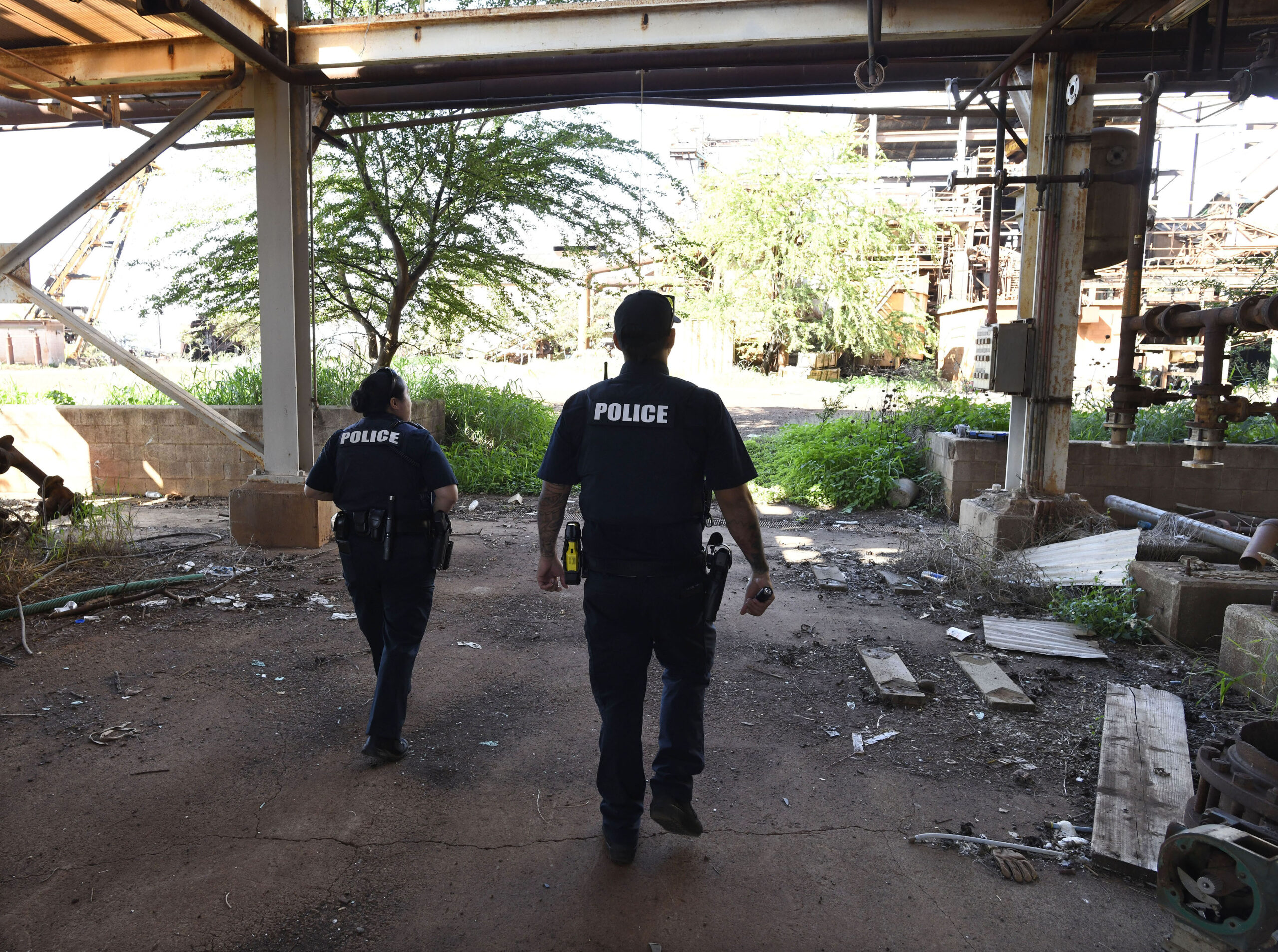 Maui Police Department officers search Puʻunēnē Mill while responding to a call of unauthorized entry in early March. Photo: Matthew Thayer for HJI
