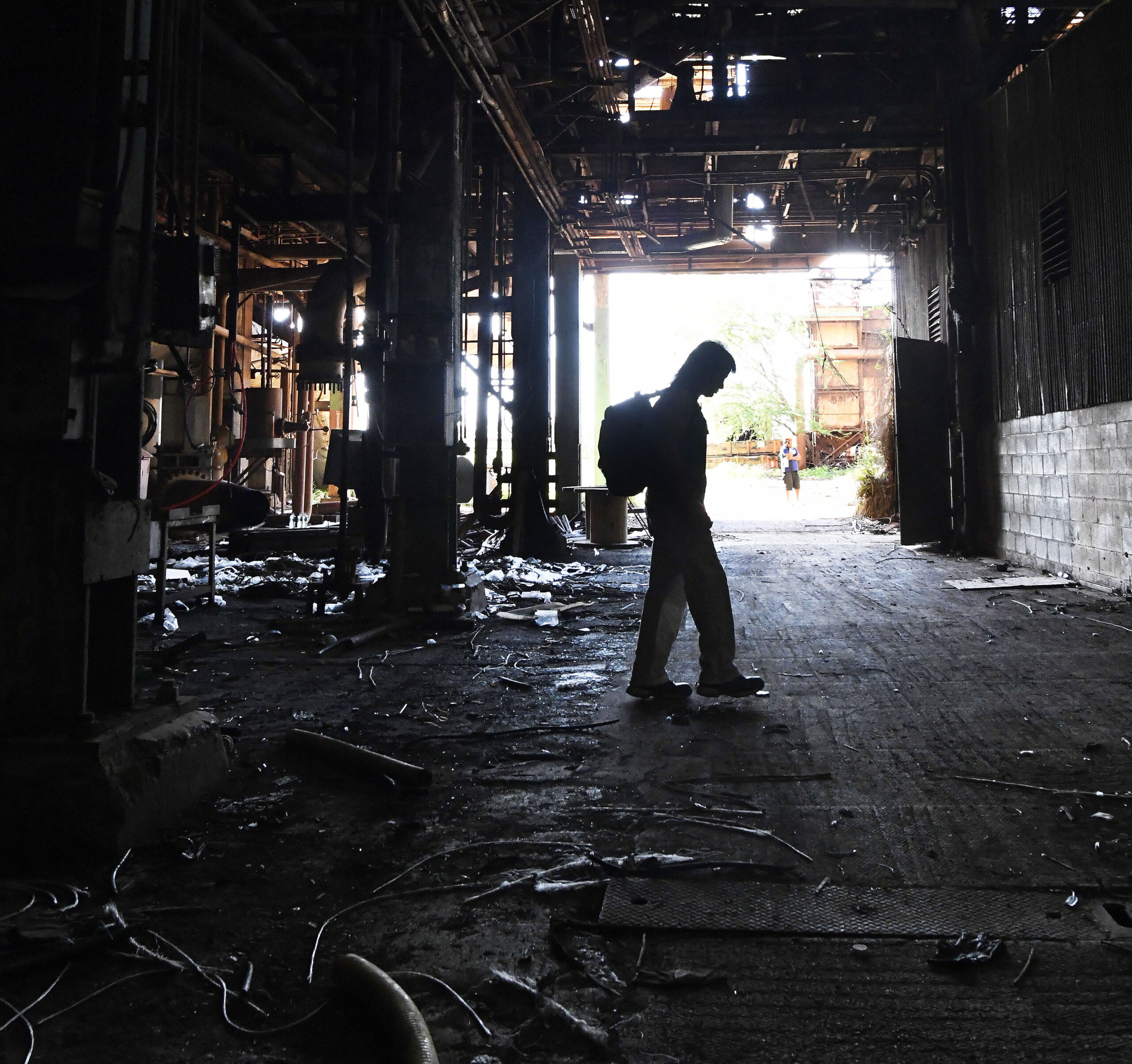 A trespasser walks through Puʻunēnē Mill after refusing orders to leave. Photo: Matthew Thayer for HJI